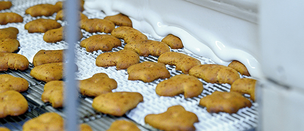 Zurück zu den Figurenlebkuchen. Die Rohlinge werden anschließend bei 250 Grad fünf bis zehn Minuten gebacken. Waren sie zuvor noch flach wie eine Lasagneplatte haben Pottasche und Hirschhornsalz ihnen im Backofen ordentlich Auftrieb gegeben. Die Lebkuchenteile werden auf der Produktionsstraße vollautomatisch weitergereicht. Dabei passieren sie eine weiße Gardine aus Zuckerguss oder werden schokoliert. Unter genauer Kontrolle der Viskosität. „Die Zuckerglasur muss danach getrocknet, die Schokolade gekühlt werden“, erläutert Peter Knaust. Das spielt sich wiederum ein paar Meter weiter im Verborgenen in einem Tunnel ab. „Die gesamte Produktion vom Teig bis zum fertigen Gebäck läuft vollautomatisch über eine Bahn von 150 Metern und dauert etwa 45 Minuten.“ Technik trifft Tradition.