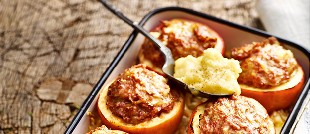 Die Hackfleischmischung auf die Äpfel verteilen und die Äpfel nebeneinander in die Form setzen.