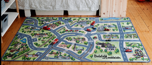 Uns war es nicht nur wichtig, dass der Teppich zum Spiel anregen sollte. Klar, schließlich ist es ja ein Spielteppich. Er soll auch die Kinder zur Kreativität animieren, ihre eigenen Geschichten zu erzählen. Die Stadt erkunden, so wie es ihnen gefällt. Weitere Straßen, Wege und Häuser dazu basteln kann jeder natürlich auch nach Belieben. Das Lieblingsziel der Bielefelder, den Tierpark Olderdissen, einfach mit Schleichtieren noch vergrößern. Polizei, Feuerwehr, das Kinderkrankenhaus mit Hubschrauberlandeplatz, aber auch Bahnhof, Rathaus und Theater – Einrichtungen, die zur Infrastruktur der Stadt gehören, sind gesetzt. Auch die Tankstelle mit E-Ladesäule fehlt nicht.