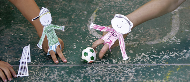Lege deine Hand auf den Karton und male oben an den Fingerspitzen und unten am Handballen einen kleinen Strich. So groß wird in etwa deine Spielfigur. Nun malst du zwischen den beiden Markierungen einen Kopf, Oberkörper und Shorts. Schneide alles aus und male dem Spieler Gesicht, Haare und Trikot mit dem Namen des Kindes. Dann schneidest du in die Shorts zwei Löcher, durch die du deine Finger stecken kannst.